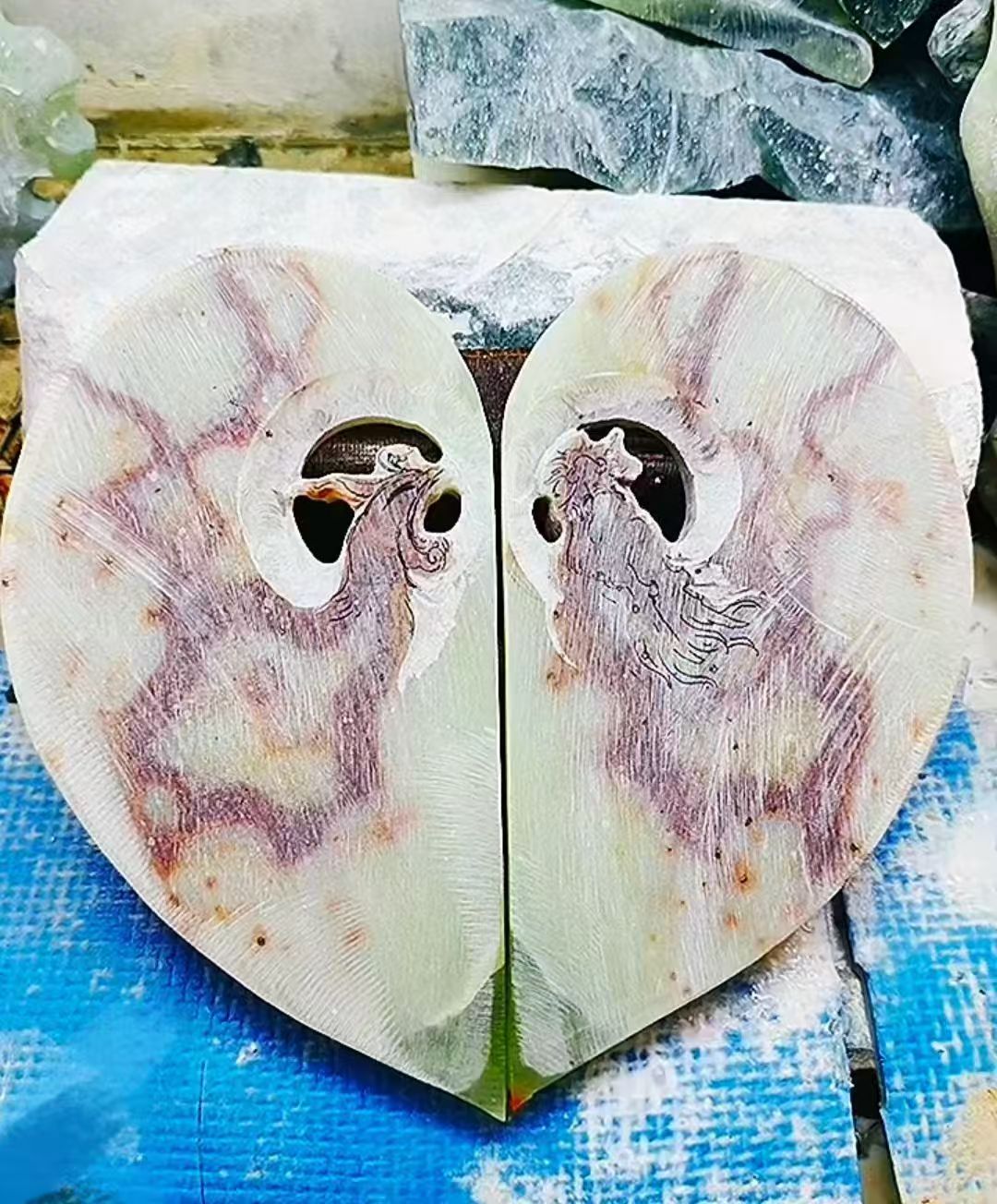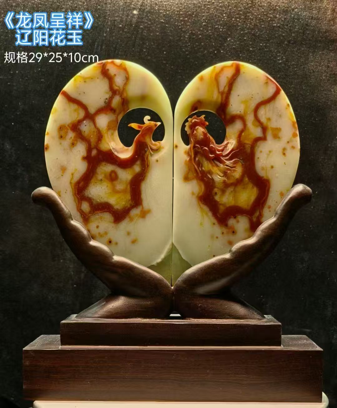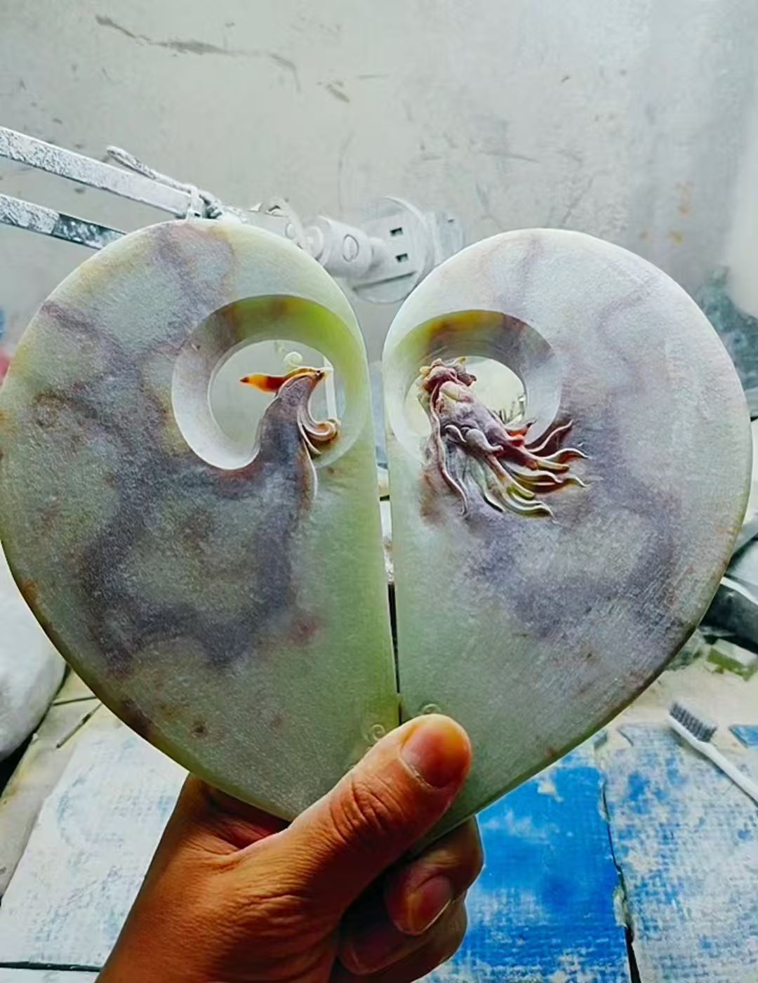 For this piece, I chose natural stone with its own colors and patterns, and followed its flow to bring these two spirits to life. The dragon rises from one side, the phoenix from the other, and together they form a heart shape, a simple and clear symbol of love. Even the base is carved like two hands holding it gently, to represent care, commitment, and protection for every love story.